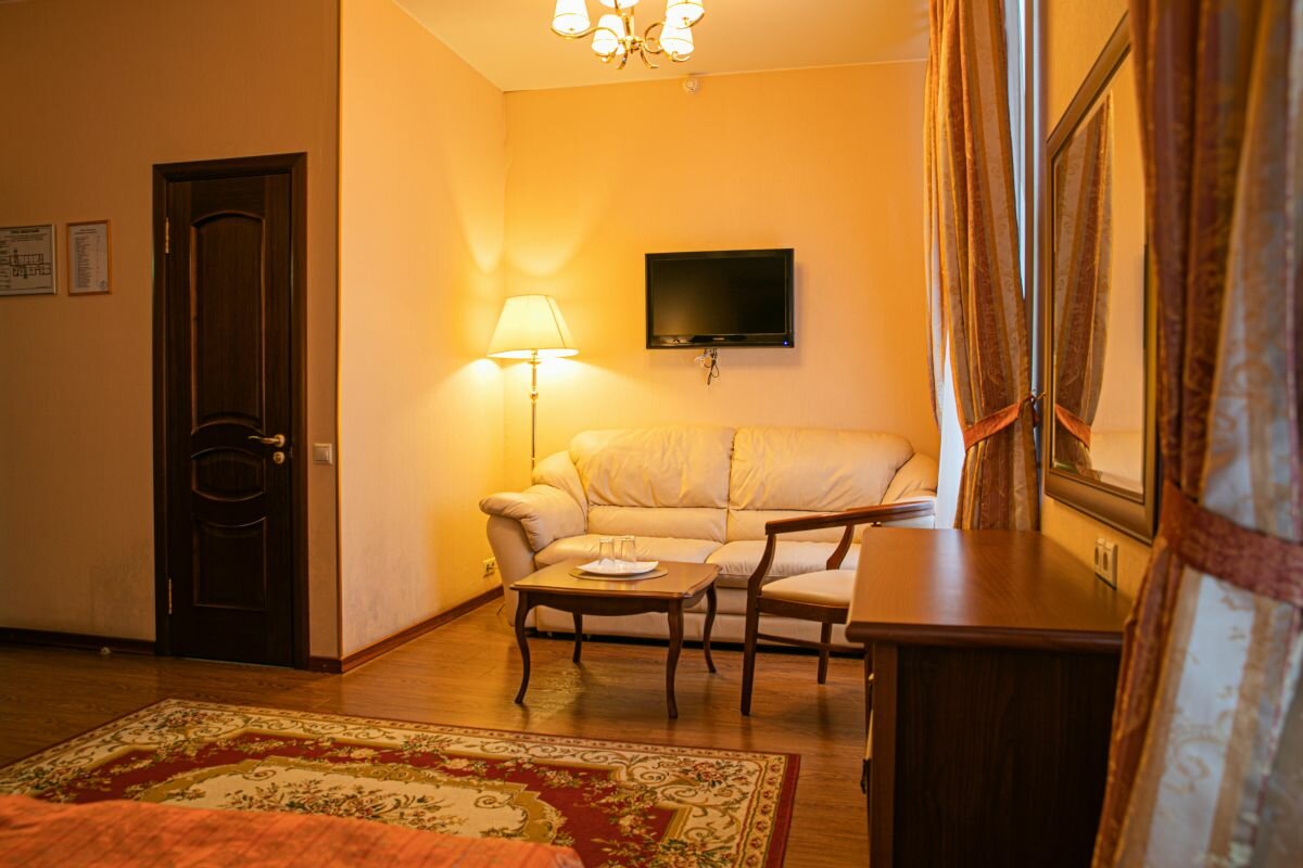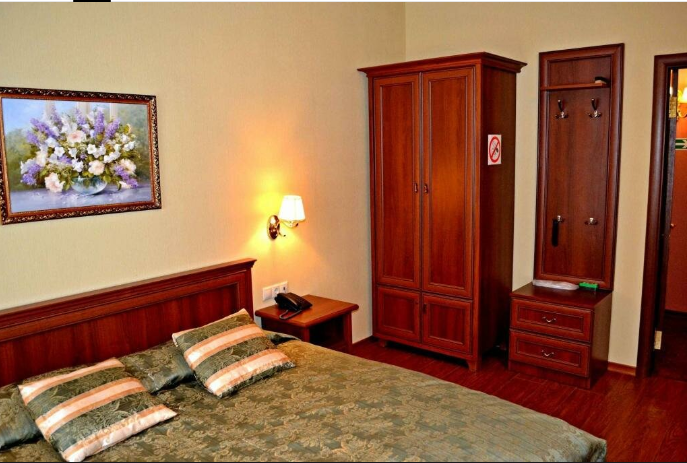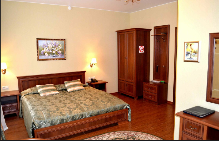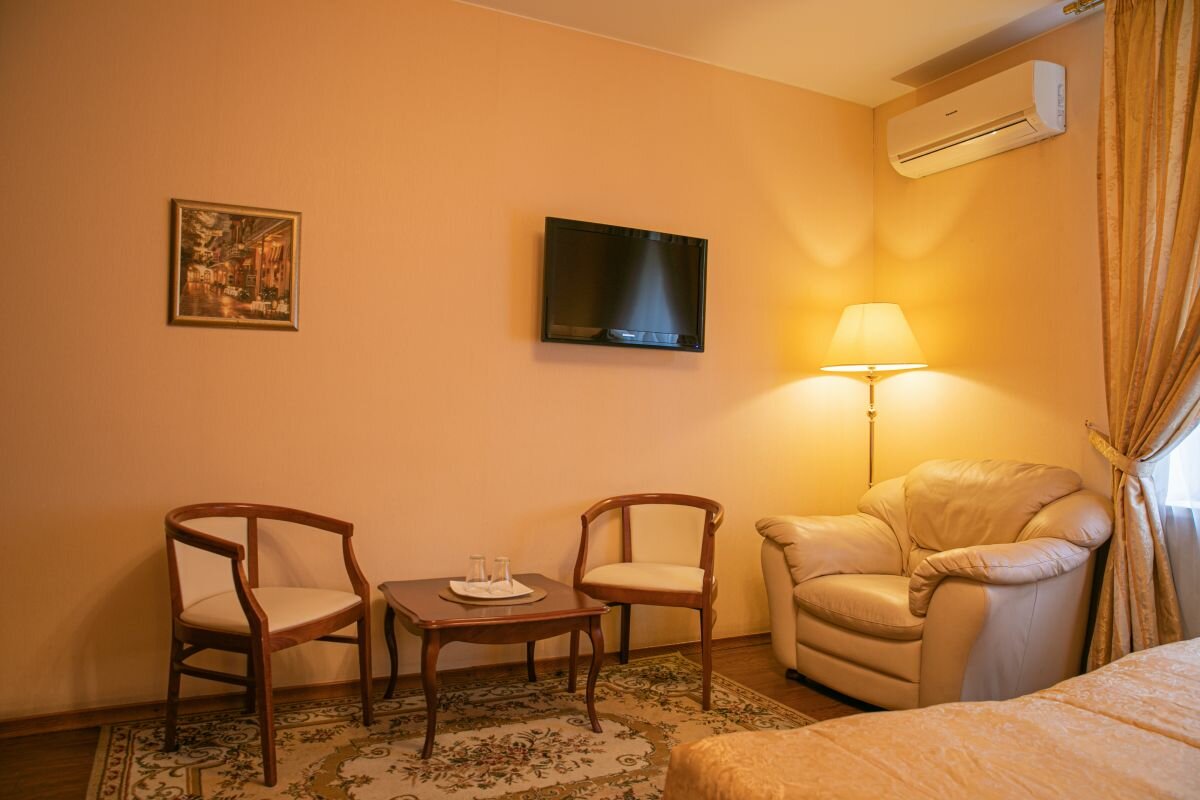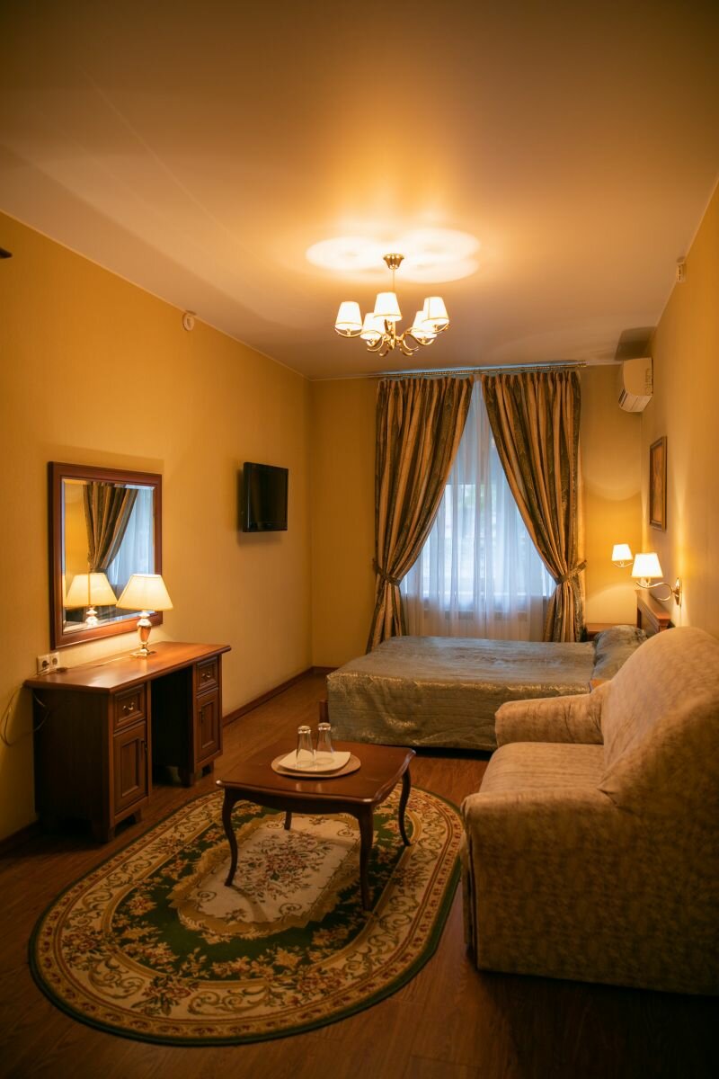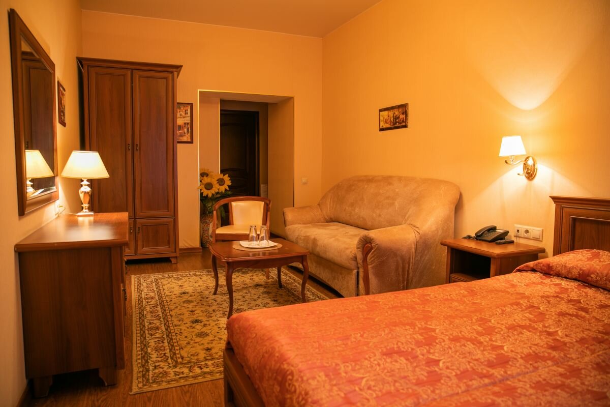 В отеле прошел капитальный ремонт, перепланировка номера Люкс позволила расширить пространство и зонировать помещение, выделить зону отдыха с диваном и журнальным столиком.