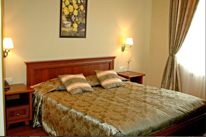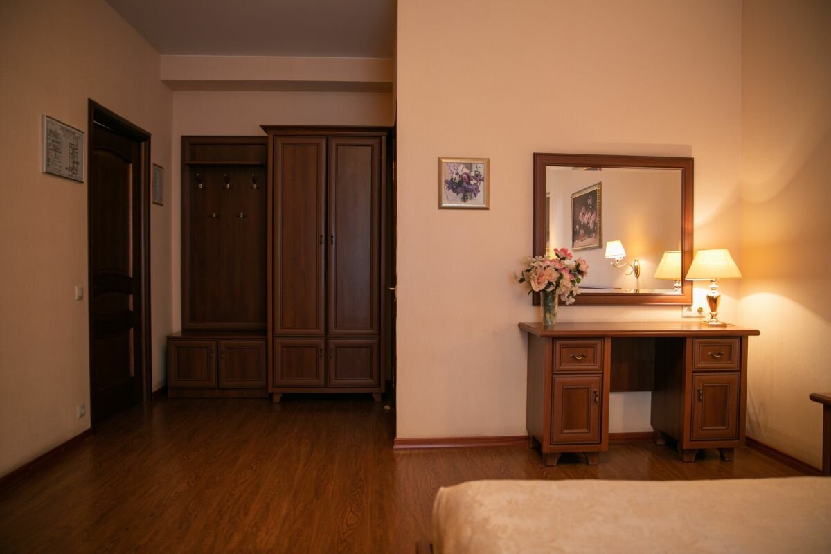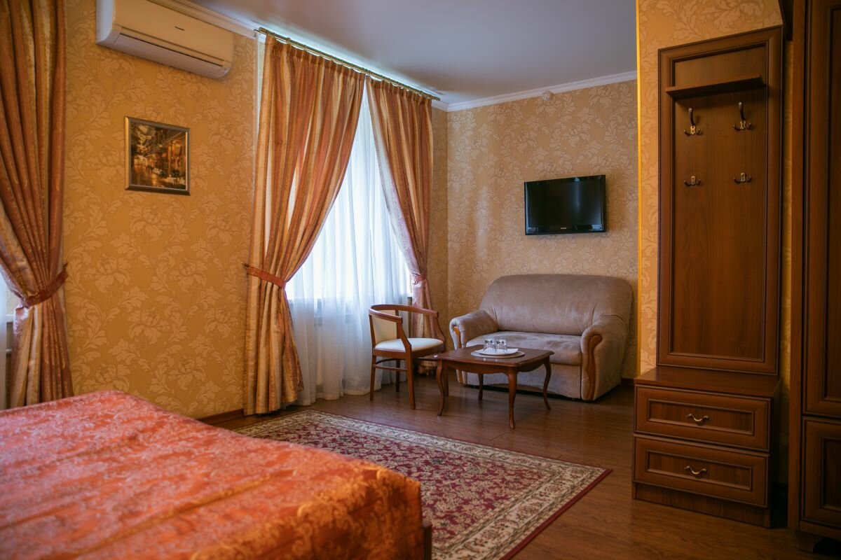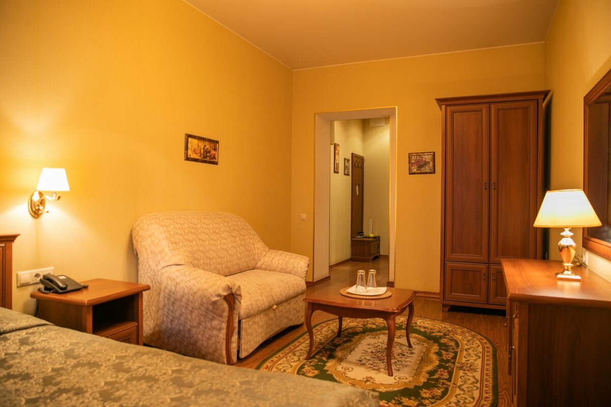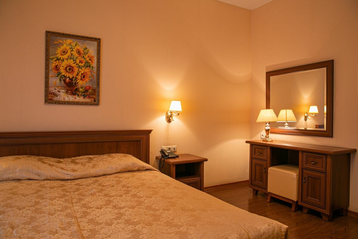 В отеле прошел капитальный ремонт, перепланировка номера Люкс позволила расширить пространство и зонировать помещение, выделить зону отдыха с диваном и журнальным столиком.