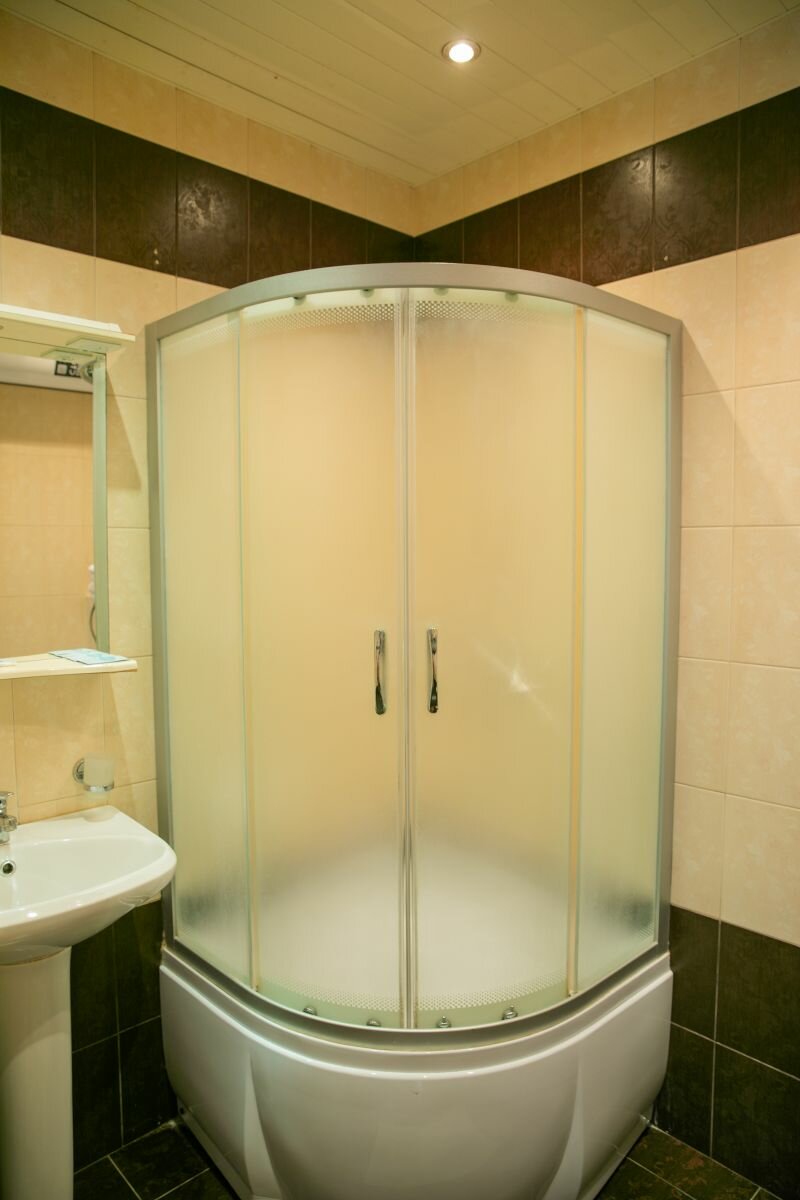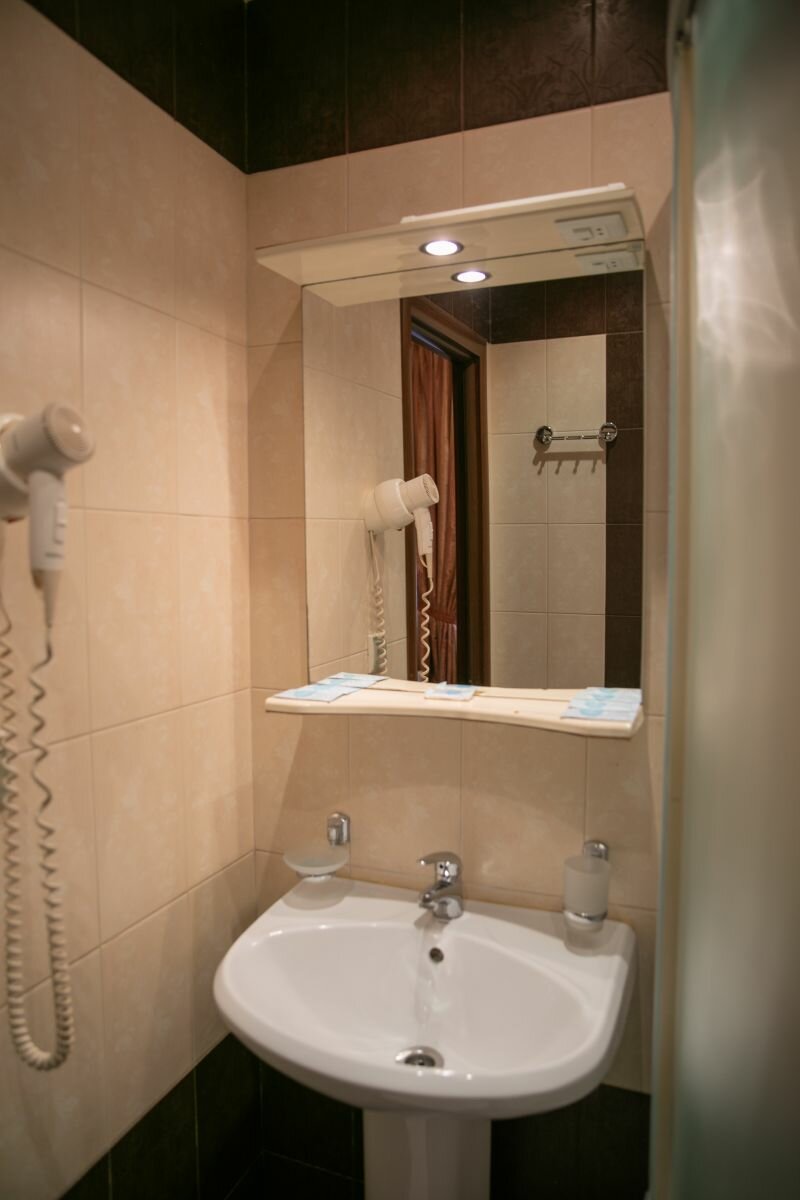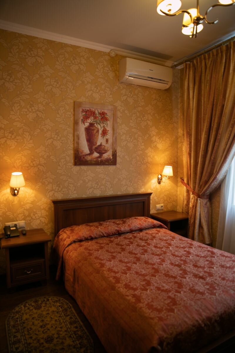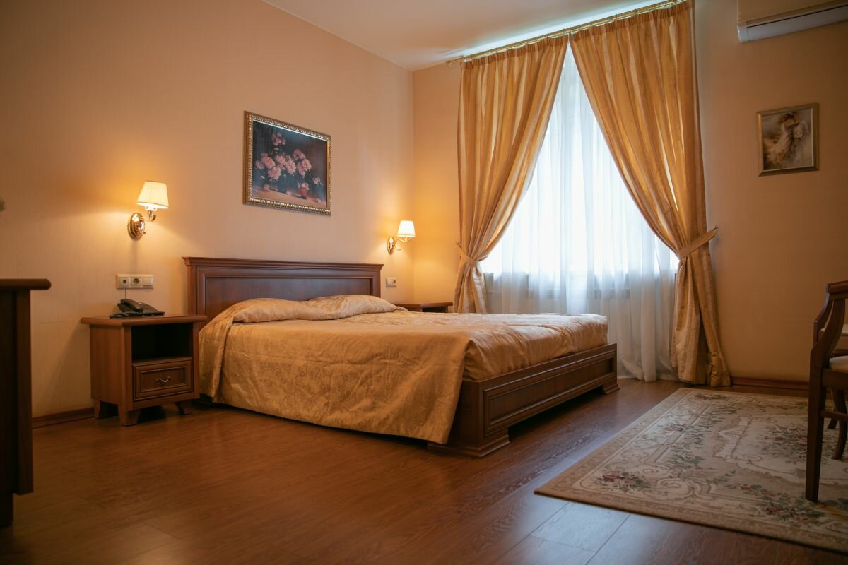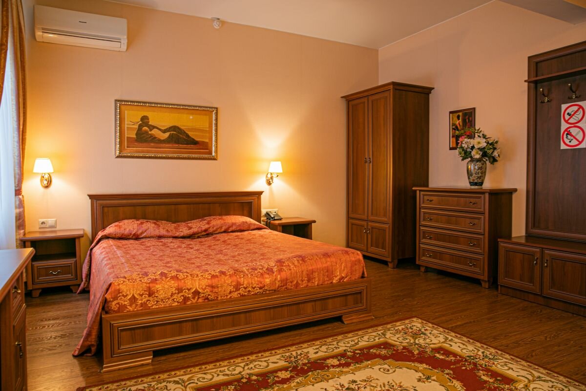 В отеле прошел капитальный ремонт, перепланировка номера Люкс позволила расширить пространство и зонировать помещение, выделить зону отдыха с диваном и журнальным столиком.